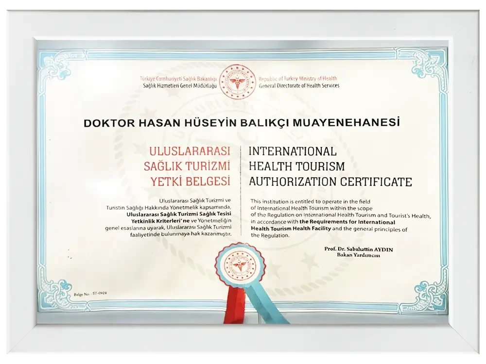 Assoc. Prof. Dr. Hüseyin Balıkçı is officially authorised to provide health tourism services under the Health Tourism Authorisation Certificate. This authorisation confirms compliance with the required standards for treating international patients. From your first consultation to post-operative follow-up, you’ll be supported through a safe, well-organised process. Plan your treatment with confidence in a recognised and regulated framework.